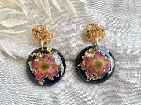 Droplet Earrings - Dark Pink Tea Tree, Black & Gold